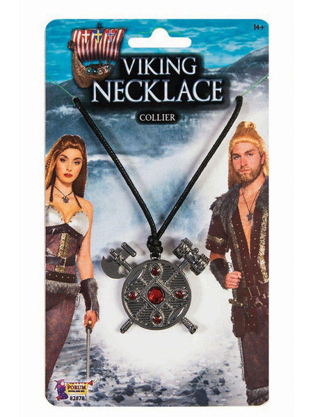 Spruce up your Viking look in a big way this year when you get all dressed up with our Viking Necklace Accessory. With this one, you will receive just the necklace you need to head to battle while still looking stylish as ever. Featuring a silver amulet medallion with red faux jewels and intersecting war hammer designs, you are definitely not going to want to miss out on this fierce Viking warrior look this year.