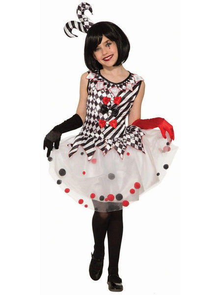 Your daughter will be looking like a magical little jester this year when you dress her up in our Kids Harlequin Clown Costume. With this set, you will receive everything you need to turn your tyke into a beautiful clownish entertainer who knows a thing or two about keeping the crowd's attention. Featuring a stunning black and white harlequin dress with red accents, as well as a matching jester hat headband, you're going to love this one for your daughter.