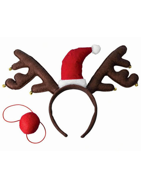 Whether you're Dasher, Dancer, Prancer, or just classic Rudolph, the Adult Reindeer Antler Headband and Nose Set will help you put the perfect touch of holiday spirit to your costume, Christmas party, or any other event! Featuring a brown headband with felt antlers, a small, festive Santa hat, and a plush red false nose attached with elastic, these seasonal accessories are sure to bring cheer to your event or costume. This brown reindeer antler headband and Rudolph nose set from Costumes.com will have you taking the lead on Santa's sleigh in no time!