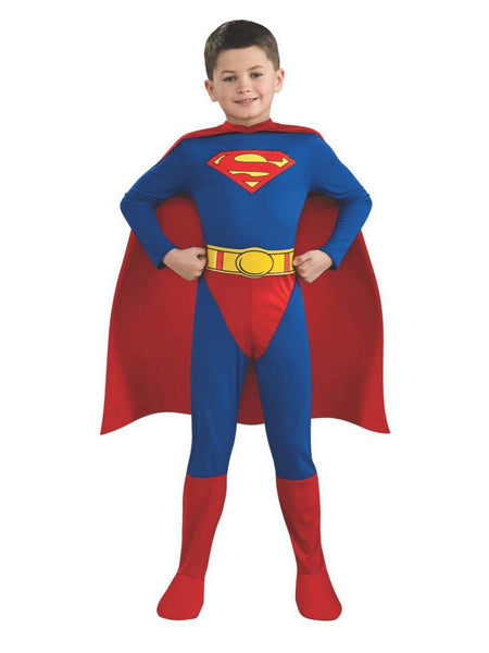 Help your little hero become the Man of Steel with this Kids' Justice League Superman Deluxe Muscle Chest Costume! This costume features a jumpsuit with a padded muscle chest and Supermans classic blue and red outfit with attached boot tops with his iconic red and yellow S. Also included is a long red cape and yellow utility belt to complete the heroic look. Your kid will be faster than a speeding bullet in this classic Superman costume!