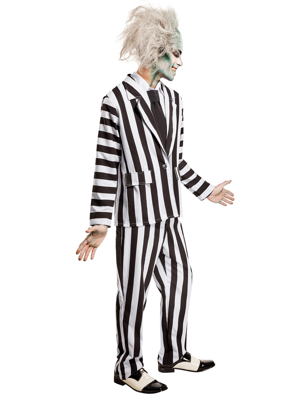 Beetlejuice is brought to life in the black and white striped suit of the Adult Beetlejuice Beetlejuice Deluxe Costume. This fun and eye-catching ensemble has everything you need to begin your transformation as the iconic character from the '80s. This bold look features a long-sleeved dress jacket with vertical stripes down the front and horizontal ones on the arms. A single black button sits at the center of the design for a closed look. For a complete look, a dickie with an attached tie is also included. A pair of matching pants with vertical stripes is also included. Complete the look with our Beetlejuice Mask or Ghost Stories Tm Makeup Kit, both sold separately. Wig and shoes are not included. See our online Size Chart to determine your best fit.