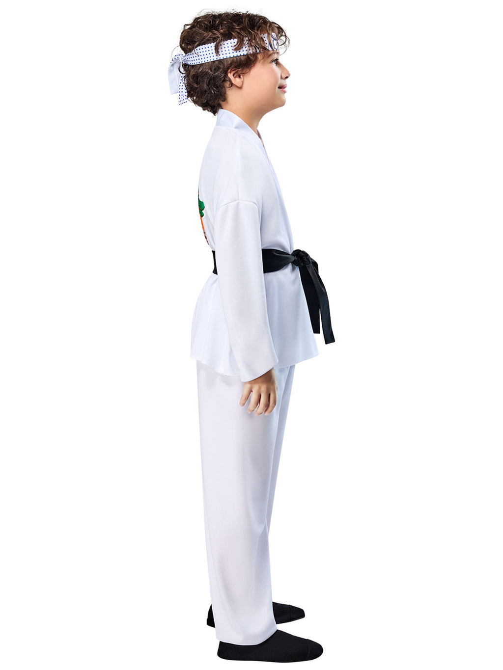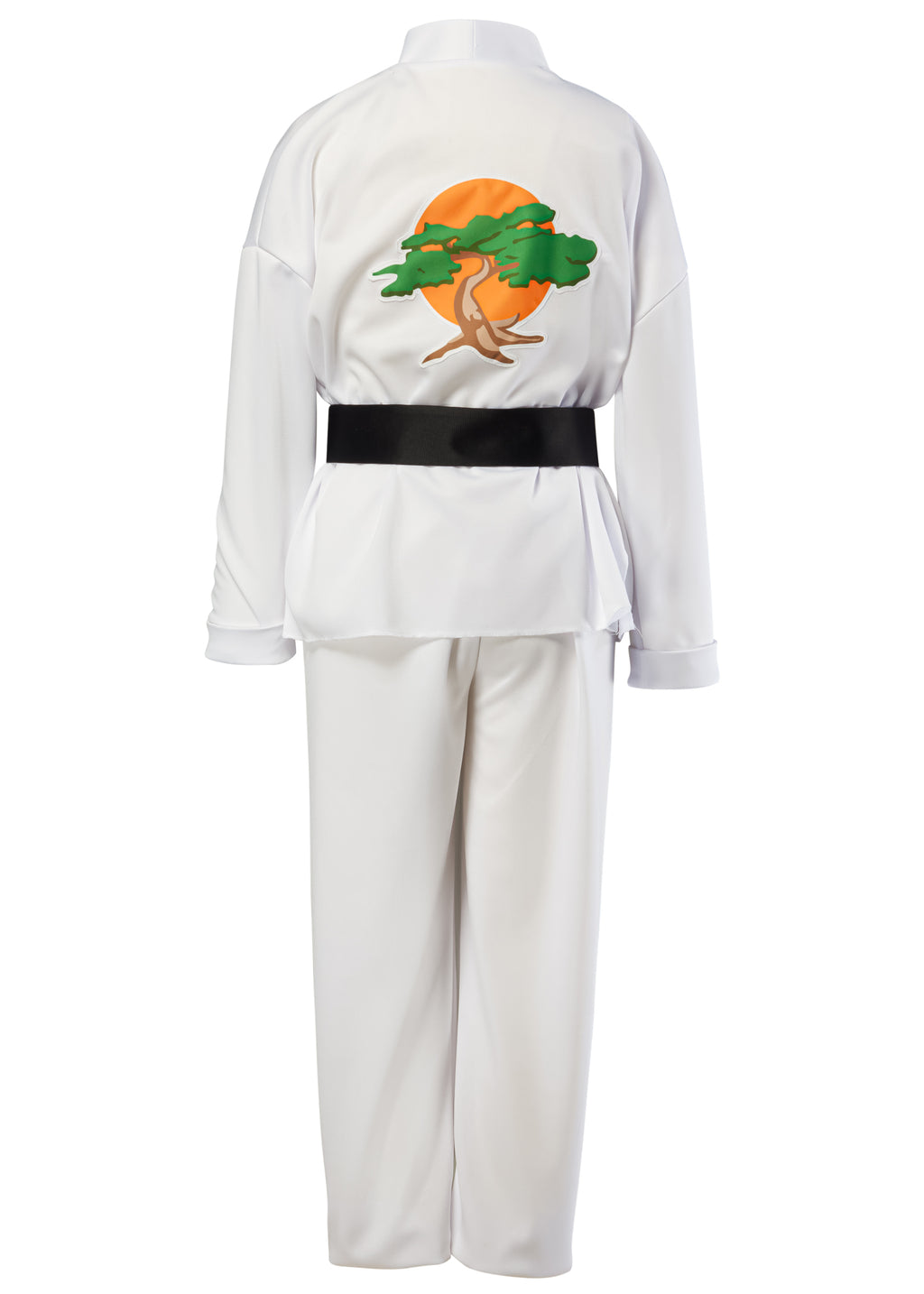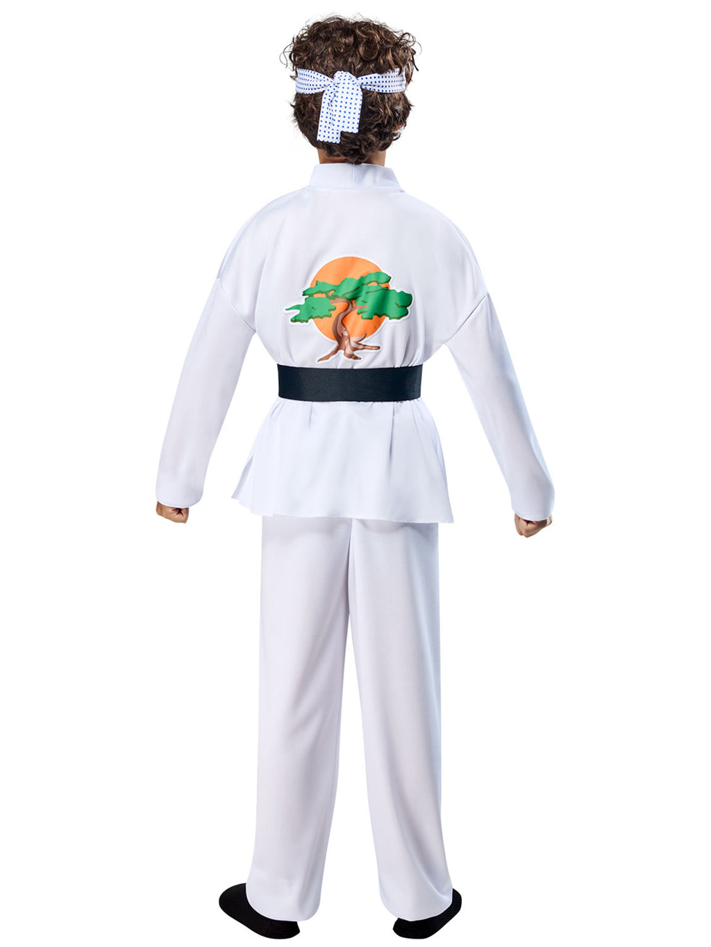 Let your child channel their inner Karate Kid with the officially licensed Boys' Karate Kid Classic Miyagi-Do Dojo Daniel LaRusso Costume. Featuring the iconic white karate style gi top and matching pants, black belt, and white and blue bonsai patterned headband, completing the legendary Karate Kid look. Perfect for Halloween, movie themed parties, martial arts events, or everyday karate fun, your little one will be the coolest ninja around. Shop now and become the next karate champion.