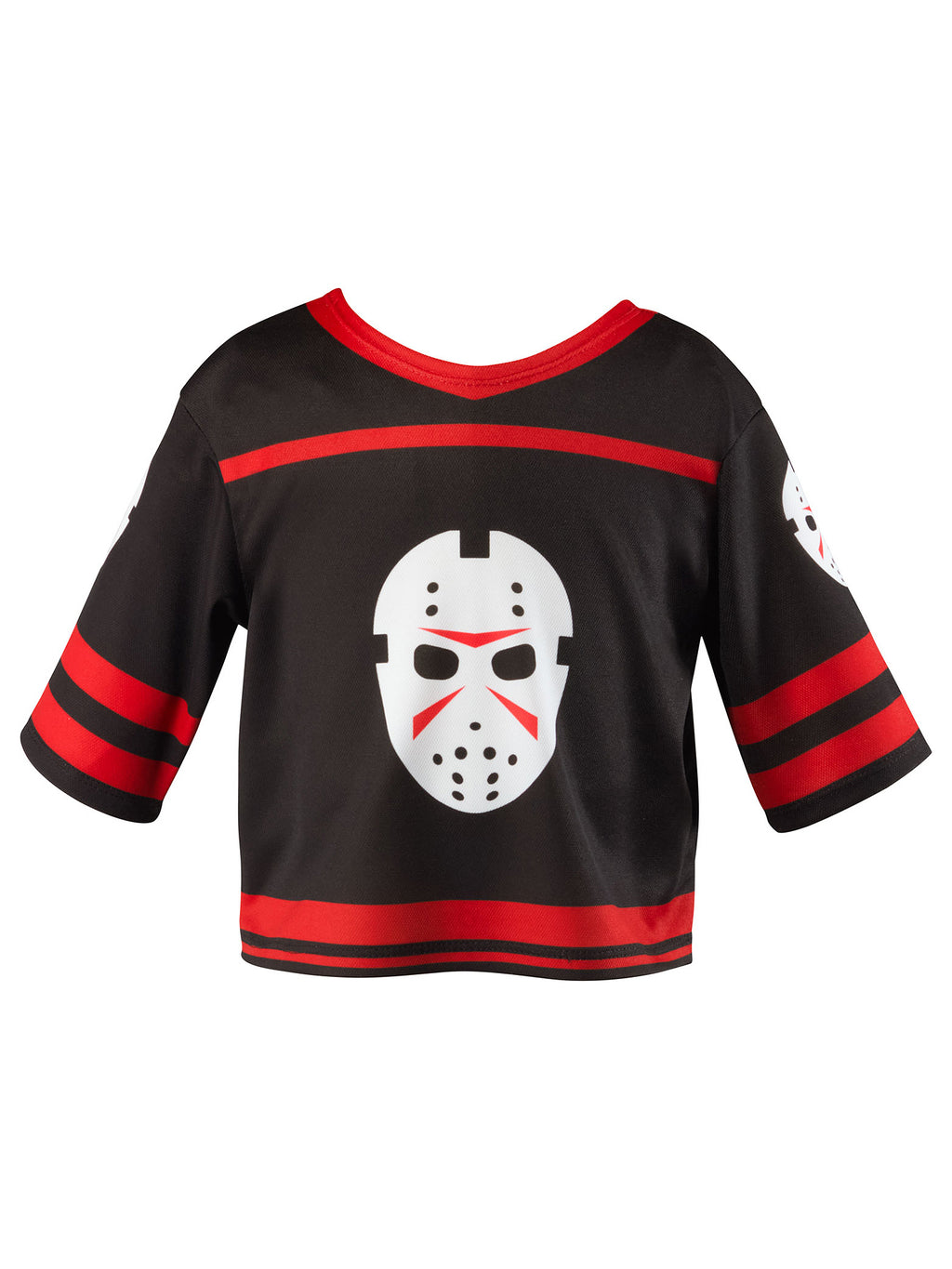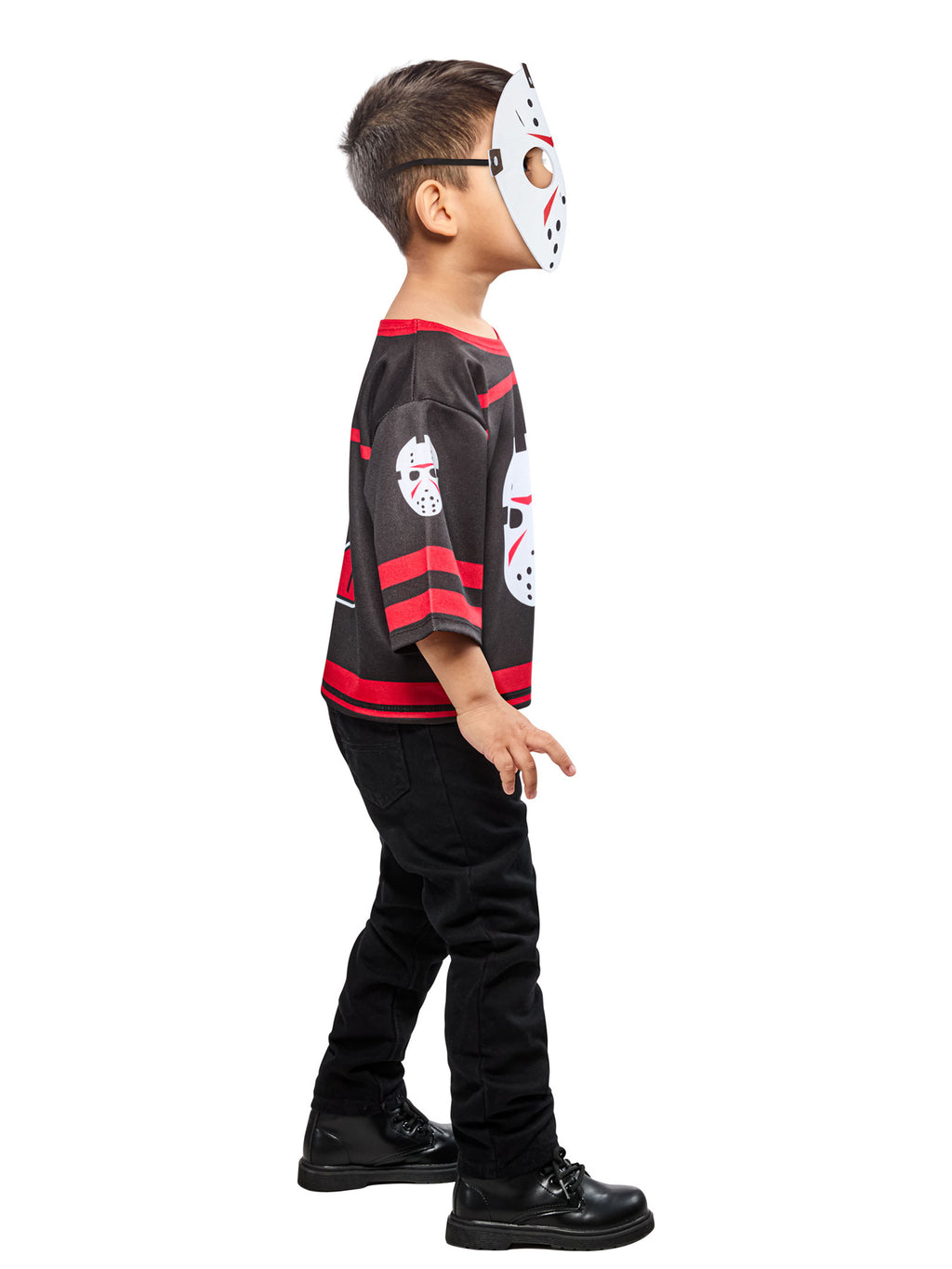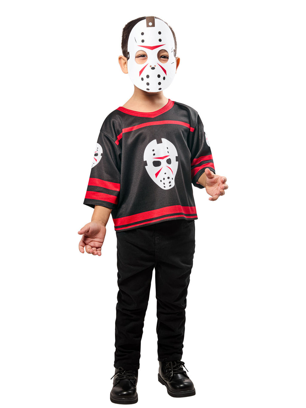 Turn your little one into the cutest horror icon with this officially licensed Friday the 13th Jason Voorhees Costume Top with Mask for Toddlers! This spooky yet fun outfit includes a black and red printed costume top designed to mimic Jason’s eerie look, complete with a felt hockey mask that creates the classic slasher vibe. Whether they're trick-or-treating or just having frightfully good fun, this Jason Voorhees toddler costume is a must-have for any tiny terror in training. Order now and let the spooky adventures begin.